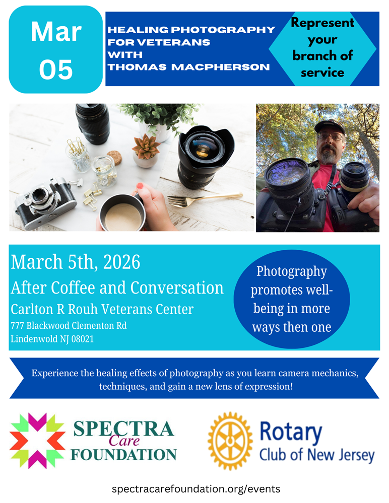 Veterans are invited to join Tom on Thursday, March 5th, after Coffee and Conversation at the Carlton R. Rouh Veterans Center to experience the healing effects of photography, learn camera mechanics and techniques, and discover a new lens of expression. Represent your branch of service! More information here!